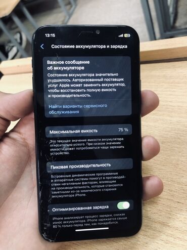 - Аккумулятор: максимальная ёмкость 75% (скриншот «Состояние аккумулятора и зарядка» приложен, показано сообщение о необходимости обслуживания).
