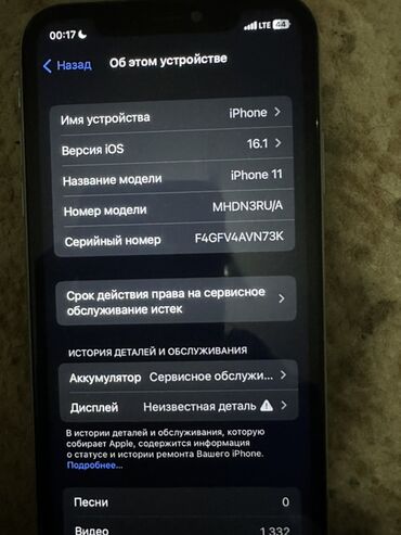 - На экране «Об этом устройстве» отображается: «Аккумулятор — Сервисное обслуживание», «Дисплей — Неизвестная деталь», срок права на сервисное обслуживание истёк