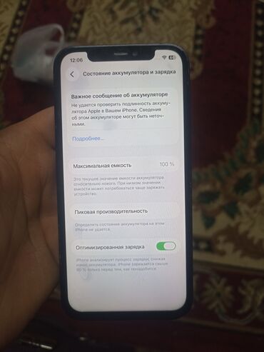 - Показано меню “Состояние аккумулятора и зарядка”: максимальная емкость 100%, включена “Оптимизированная зарядка”. На экране также отображается сообщение системы о невозможности проверить подлинность аккумулятора