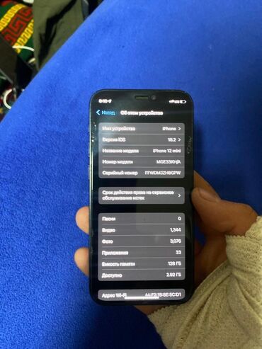 Компактный флагман с мощным чипом, отличными камерами и удобными размерами для одной руки. На скриншоте из «Об этом устройстве» видно: модель iPhone 12 mini, номер модели MGE53K/A, емкость 128 ГБ.