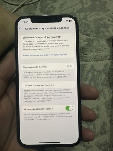 - Состояние аккумулятора по iOS: максимальная ёмкость 74% (в системе отображается сообщение о необходимости сервисной замены для восстановления полной ёмкости и производительности).