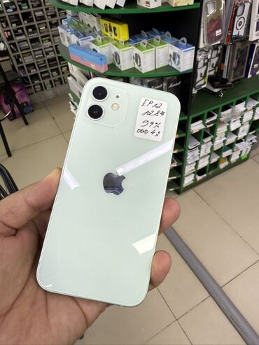 - iPhone 12, 128 ГБ (салатовый). Двойная камера, плоские грани, стекло. На наклейке — ёмкость батареи 94, цена 24000 сом
