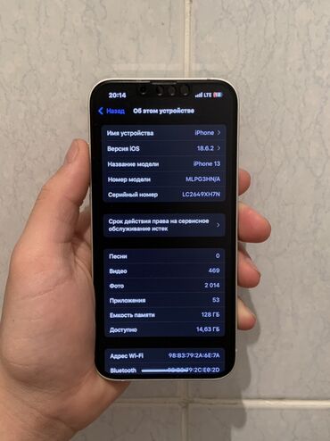IPhone 13, 128 ГБ, цвет Midnight (черный). Характеристики и детали по фото: - Объем памяти: 128 ГБ, доступно ~113,5 ГБ. - Поддержка двух eSIM/IMEI (указаны на скриншоте «Об этом устройстве»). - Эк...