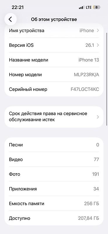 IPhone 13, модель MLP23RK/A, цвет Midnight (тёмный). Память 256 ГБ, доступно около 207,8 ГБ. iOS 16.1. Максимальная ёмкость аккумулятора — 82%, включена функция «Оптимизированная зарядка». Поддержка LTE.