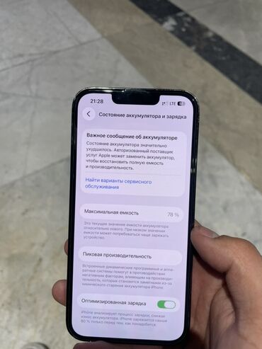 - Состояние аккумулятора: максимальная ёмкость 78%, включена оптимизированная зарядка