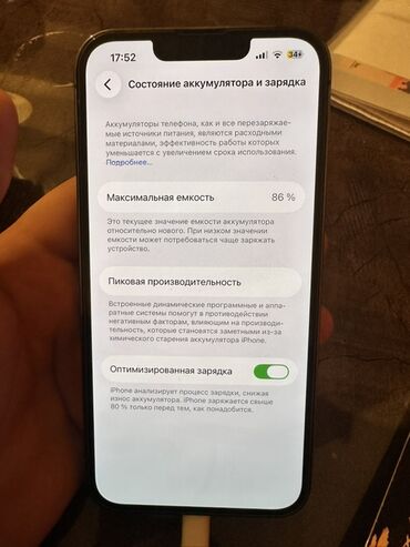 - Аккумулятор: максимальная ёмкость 86%, пиковаЯ производительность поддерживается, включена «Оптимизированная зарядка»