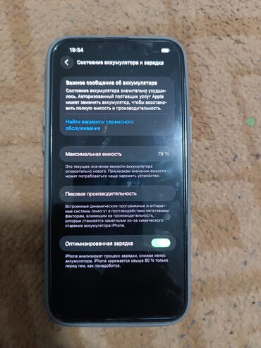 - На экране в меню “Состояние аккумулятора и зарядка” отображается: максимальная ёмкость 79%, включена оптимизированная зарядка; показано системное уведомление о необходимости сервисной замены аккумулятора для восстановления полной ёмкости и производительности