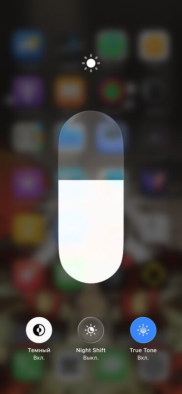 - Встроенные функции экрана управления яркостью: Тёмный режим включён, True Tone включён, Night Shift выключен.