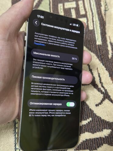 - Состояние батареи в настройках на фото: максимальная ёмкость 98%, включена «Оптимизированная зарядка».