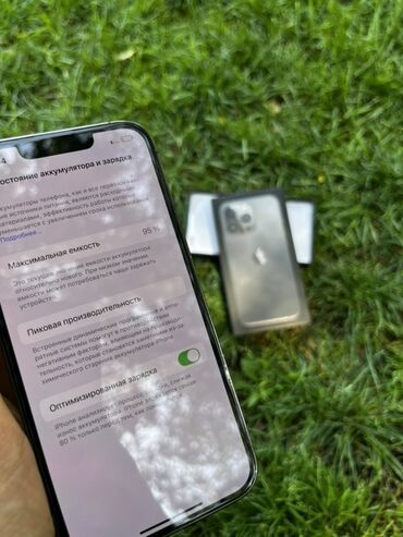 Смартфон Apple iPhone 13 Pro в цвете «графит» с тремя основными камерами и фирменным логотипом Apple на задней панели. Устройство оснащено большим дисплеем с вырезом под фронтальную камеру и датчики. Состояние аккумулятора составляет 95% от максимальной емкости. Телефон поддерживает оптимизированную зарядку для продления срока службы батареи. В комплекте идет прозрачный чехол для дополнительной защиты.