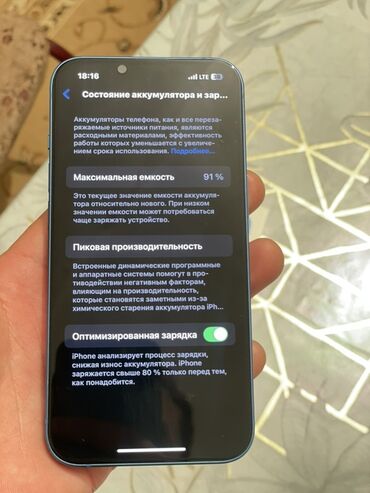 - В меню «Состояние аккумулятора» отображается максимальная ёмкость 91%, включена «Оптимизированная зарядка»