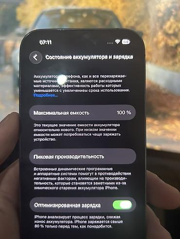 - Состояние аккумулятора: максимальная ёмкость 100%, пиковая производительность нормальная, включена оптимизированная зарядка
