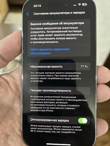 Дополнительно по состоянию аккумулятора: на экране «Состояние аккумулятора» отображается максимальная ёмкость 77% и сообщение о необходимости обслуживания аккумулятора.