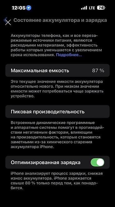 - Аккумулятор: максимальная ёмкость 87% (скриншот в галерее), включена «Оптимизированная зарядка»