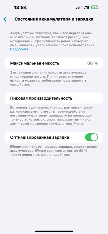 - Состояние аккумулятора по iOS: максимальная ёмкость 88%