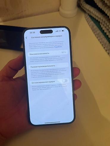 IPhone 14 Pro, цвет Space Black (чёрный). Экран с Dynamic Island, диагональ 6.1". На фото видно состояние аккумулятора в системе — максимальная ёмкость 90%. Тройная основная камера с телефото, широкоугольным и сверхширокоугольным модулями, вспышка. Корпус с плоскими гранями из металла, стеклянная задняя панель с логотипом Apple. Поддержка Face ID, 5G/LTE, две eSIM/нано‑SIM (в зависимости от региона), MagSafe и беспроводная зарядка. Высокая плавность интерфейса с частотой обновления 120 Гц (ProMotion). В комплекте на фото — чёрный защитный чехол. На дисплее видна тонкая трещина в нижней части.