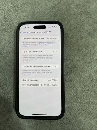 - Аккумулятор: состояние «Нормальное», максимальная емкость 91%. В разделе «Состояние аккумулятора» указано: 382 цикла перезарядки; дата изготовления устройства — май 2024; первое использование — октябрь 2024.