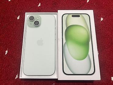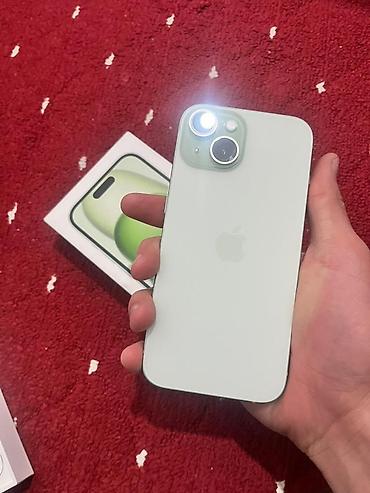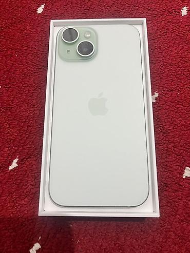 Смартфон Apple iPhone 15 с объемом памяти 128 ГБ. Устройство выполнено в светлом мятно-зеленом цвете, оснащено двойной камерой и плоскими гранями корпуса. На экране отображается динамический остров...