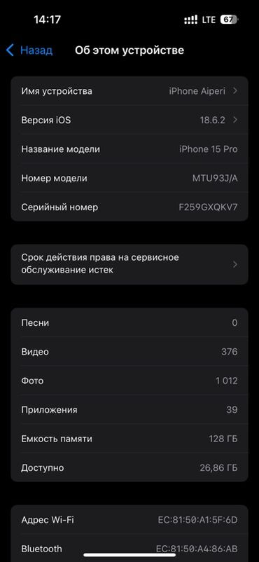 - На экране «Об этом устройстве» указано: iPhone 15 Pro, серийный номер виден на скриншоте