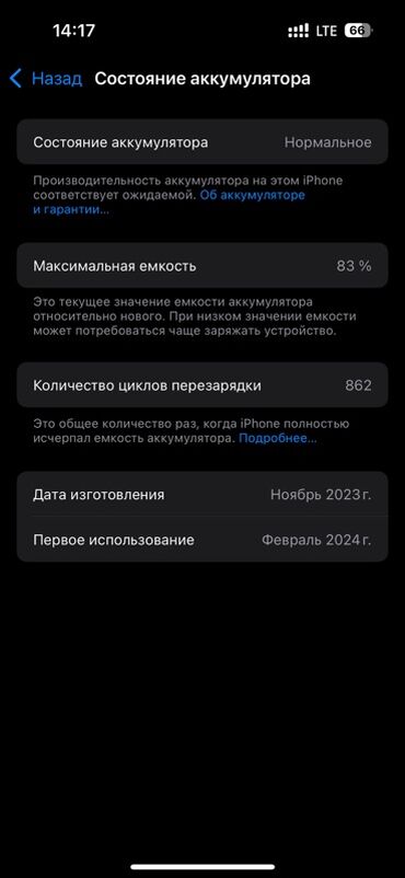 - Аккумулятор: максимальная ёмкость 83%, 862 цикла; состояние — «Нормальное» (по данным системы)