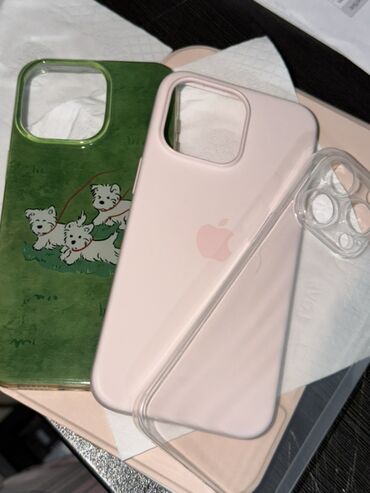 - набор чехлов: прозрачный, розовый (с логотипом Apple (Оригинал), зелёный с рисунком, а также защитная накладка на блок камер