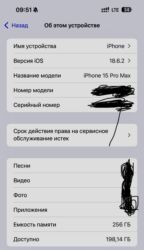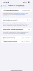 - Аккумулятор: состояние «Нормальное», максимальная ёмкость 87%, 419 циклов; дата изготовления июня 2024 г., первое использование — август 2024 г.