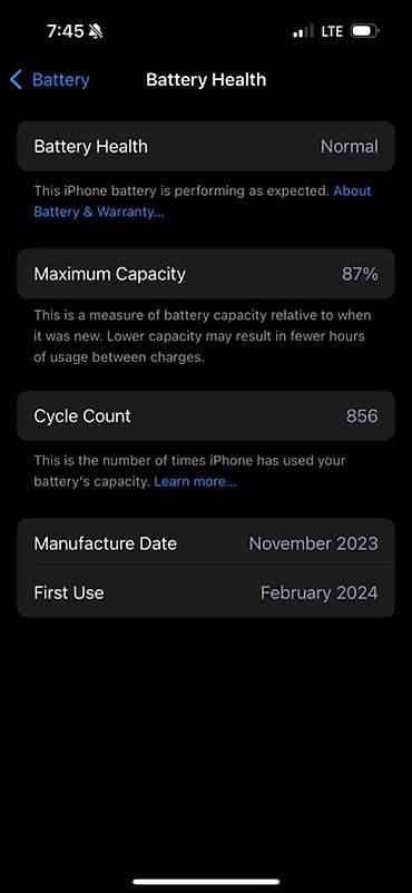 - Производство: ноябрь 2023; первое включение: февраль 2024 (по сведениям из меню Battery Health).