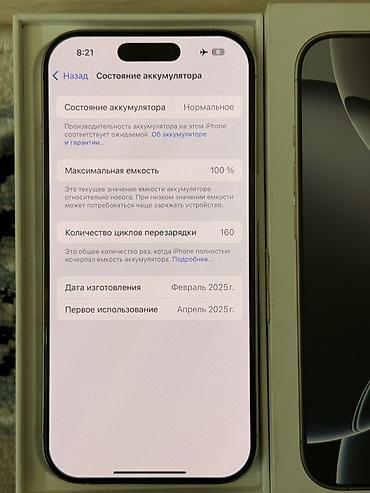 - Аккумулятор: максимальная ёмкость 100%, состояние «Нормальное», 160 циклов перезарядки.