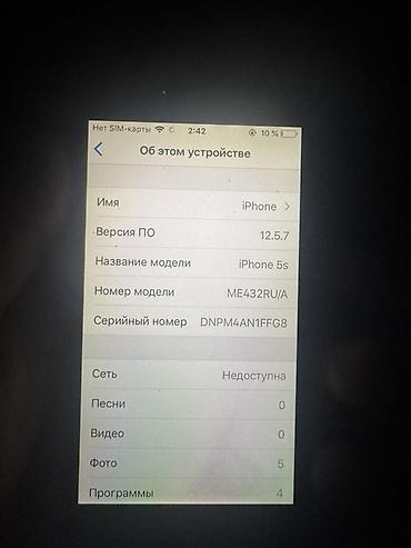 IPhone 5s, серебристый, модель ME298LL/A. Основные характеристики: - Диагональ экрана 4" - Touch ID (кнопка «Домой» со сканером отпечатка) - iOS 12.5.7 установлен - Память: указаны медиаданные на ...