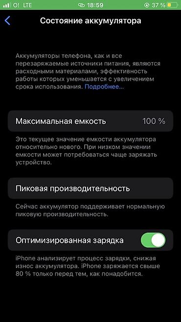 - Аккумулятор: максимальная ёмкость 100%, поддерживается нормальная пиковая производительность; включена «Оптимизированная зарядка»