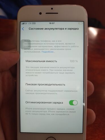 - Аккумулятор: максимальная ёмкость 100%, нормальная пиковая производительность; включена «Оптимизированная зарядка»