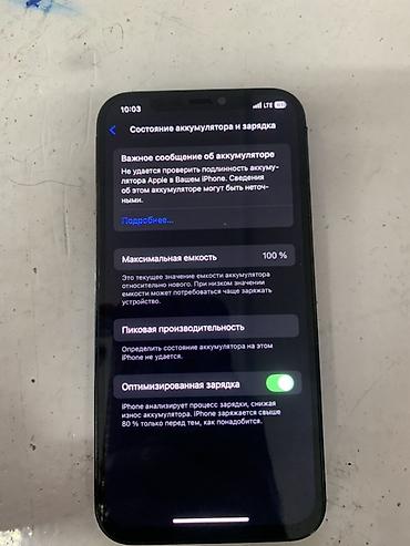- Раздел «Состояние аккумулятора»: максимальная ёмкость отображается 100%. Есть предупреждение «Не удаётся проверить подлинность аккумулятора Apple». Включена «Оптимизированная зарядка».