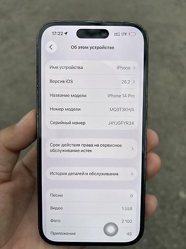 IPhone 14 Pro 🔥 📍Память - 512гб 📍АКБ - 83% 📍Не вскрытый 💯 📍Face , True Tone ✅️ 📍Состояние отличное 👍 💸Цена - 48000 сом 📍Отправляем по всем регионам КР🇰🇬 📍Trade In- Обмен есть 🤝 Для подробной ...