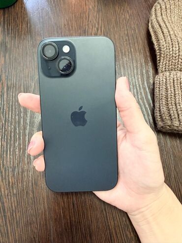 IPhone 15 (чёрный цвет), компактный корпус с плоскими гранями. Экран — без выреза-«чёлки» (динамическая область), защитное стекло. На задней панели — двойной модуль камер диагональной компоновки с вспышкой.