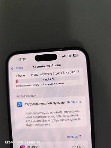 - Объём памяти: 512 ГБ (на экране «Хранилище iPhone» видно: используется ~25,41 ГБ из 512 ГБ).