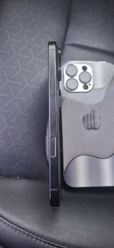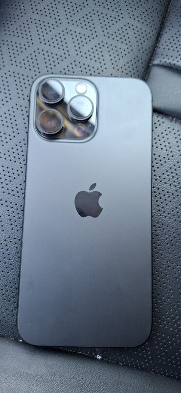 IPhone (16 ProMaxцвет чёрный/серый). Плоские грани, матовая задняя панель с логотипом Apple. Блок из трёх камер с лидаром/вспышкой: