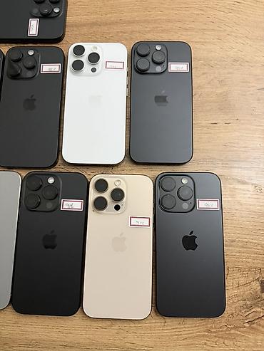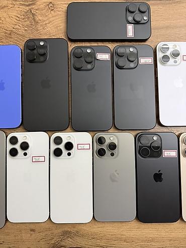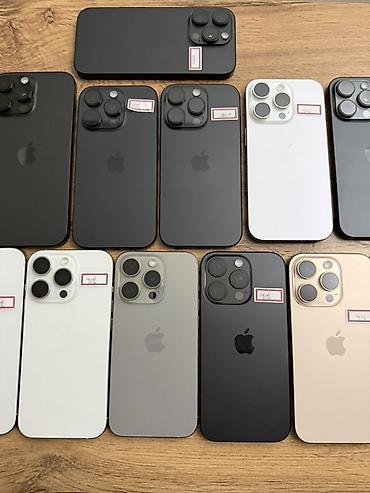 - Несколько моделей iPhone Pro и Pro Max в чёрном, белом, серебристо‑сером и золотом цветах.
