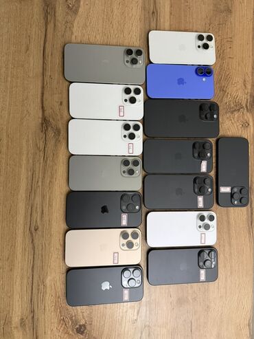 Предлагаются смартфоны линейки iPhone последних поколений, преимущественно серии Pro/Pro Max, а также несколько устройств в стандартной линейке. На фото видно разнообразие расцветок и корпусов: