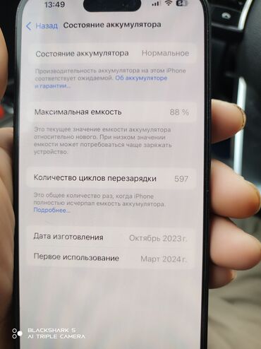 - Аккумулятор: максимальная ёмкость 88%, количество циклов перезарядки 597.