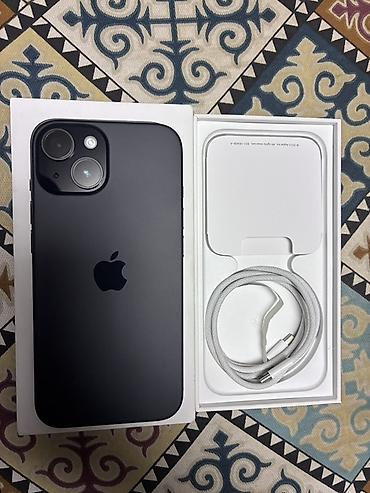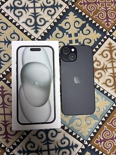 Apple iPhone 15 серия — компактный корпус, двойная камера). Цвет: чёрный/«Midnight». В комплекте: коробка, кабель USB‑C to USB‑C, документация.