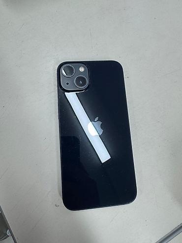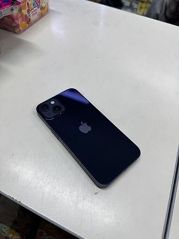 IPhone 13 с двойной камерой, цвет темно‑синий (Midnight). Корпус со строгими плоскими гранями, стеклянная задняя панель с логотипом Apple, модуль камер диагонального расположения: основной широкоугольный и сверхширокоугольный объективы, светодиодная вспышка. Кнопка питания на правой грани, на левой — переключатель беззвучного режима и клавиши громкости. Компактный форм‑фактор.