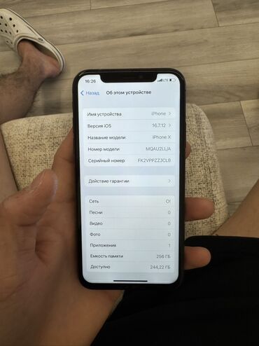 В комплекте на фото — сам смартфон. На экране показана системная информация: iPhone X, iOS 16.7.12, память 256 ГБ. Камера и дисплей работают, сеть LTE отображается. Отличный вариант с большим объёмом памяти и классическим дизайном без рамок.