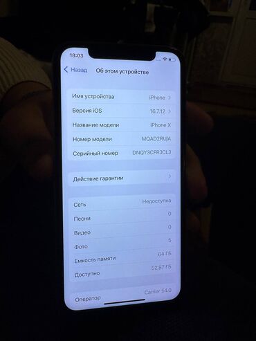 IPhone X, 64 ГБ, серебристый Характеристики и детали с устройства: - Модель: iPhone X - Память: 64 ГБ (доступно ~44,78 ГБ) - Версия iOS: 16.7.12 - Сеть: отображается Beeline KG - Фото в медиатеке:...