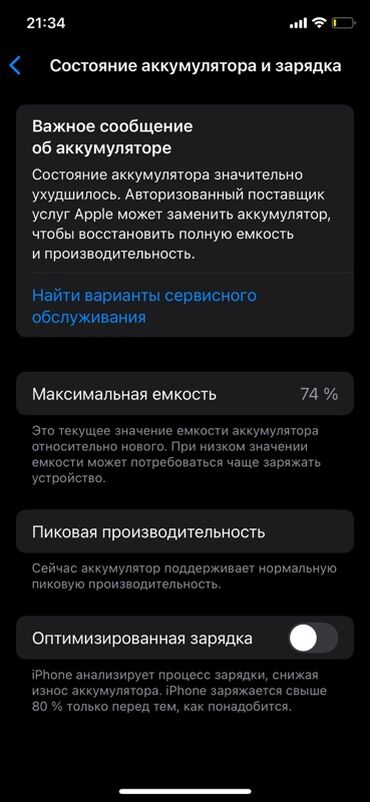 - Состояние аккумулятора по iOS: максимальная ёмкость 74% (на скриншоте есть системное уведомление о необходимости замены для восстановления полной ёмкости)