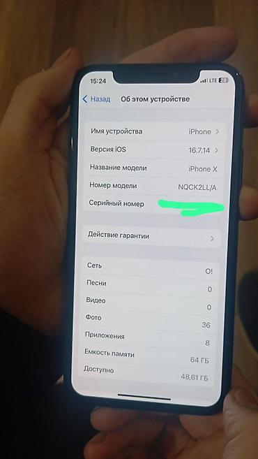 IPhone X, 64 ГБ, серебристый Характеристики и детали с устройства: - Модель: iPhone X - Память: 64 ГБ (доступно ~44,78 ГБ) - Версия iOS: 16.7.12 - Сеть: отображается Beeline KG - Фото в медиатеке:...