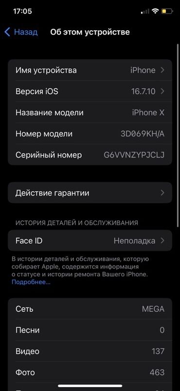 IPhone X, 64 ГБ - Модель: iPhone X (номер модели NQAC2KH/A) - iOS: 16.7.12 - Память: 64 ГБ - Сеть: LTE - Face ID: отмечена неполадка в разделе «История деталей и обслуживания» - Экран: работает, н...