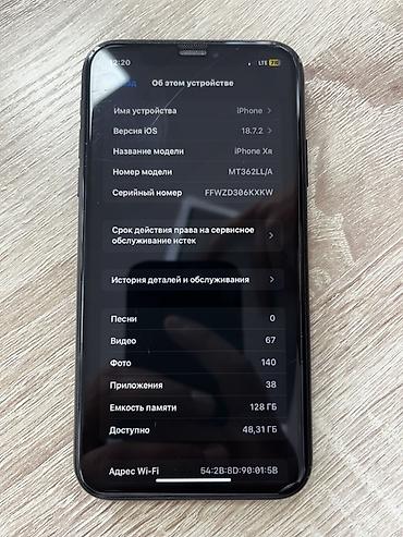 На устройстве сейчас: 67 видео, 140 фото, 38 приложений; доступно 48,31 ГБ. Срок права на сервисное обслуживание истек (по данным в настройках). Серийный номер и адрес Wi‑Fi отображены на скриншоте в настройках на фото. Цвет корпуса — черный.