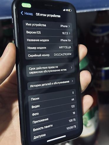 IPhone XR, модель MRY2LL/A, черный цвет. Память 128 ГБ (свободно ~101,93 ГБ). Установлена iOS 18.7.3. Экран Liquid Retina, Face ID, разъём Lightning. Одна основная камера с вспышкой, фронтальная камера, стереодинамики. Поддержка LTE, Wi‑Fi, Bluetooth, NFC (Apple Pay). Аккумулятор: максимальная ёмкость 79%; в настройках отображается уведомление о необходимости сервисной замены для восстановления полной ёмкости. Оптимизированная зарядка включена. На фото — реальные скриншоты разделов «Состояние аккумулятора» и «Об этом устройстве». Компактный корпус, кнопки громкости и питания работают. Отличный вариант с большим объёмом памяти и актуальной iOS.