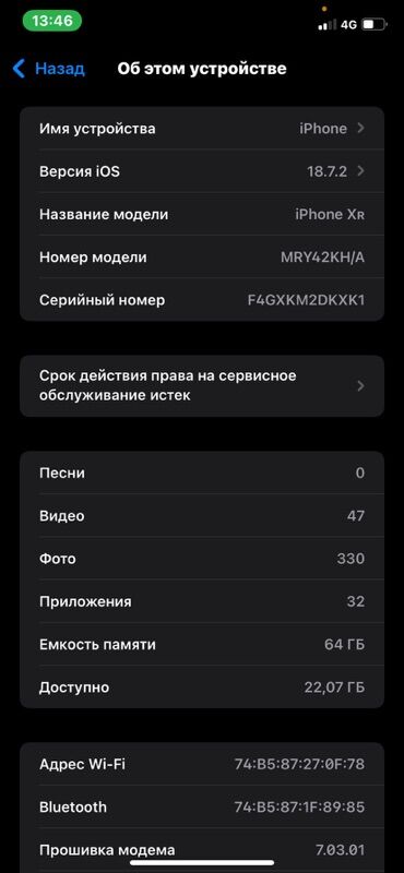IPhone XR, 64 ГБ, чёрный - Модель: iPhone XR (модель MH6M3RU/A) - Память: 64 ГБ, доступно около 44,3 ГБ - iOS: 18.2 - Экран: 6.1", True Tone включён, поддержка тёмной темы и Night Shift - Камера: ...