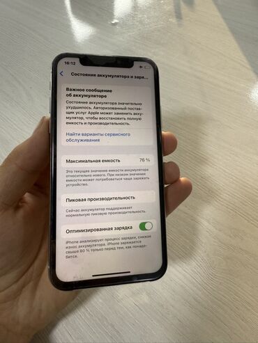 - Аккумулятор: максимальная ёмкость 76% (в настройках отображается уведомление о снижении состояния; включена «Оптимизированная зарядка»)